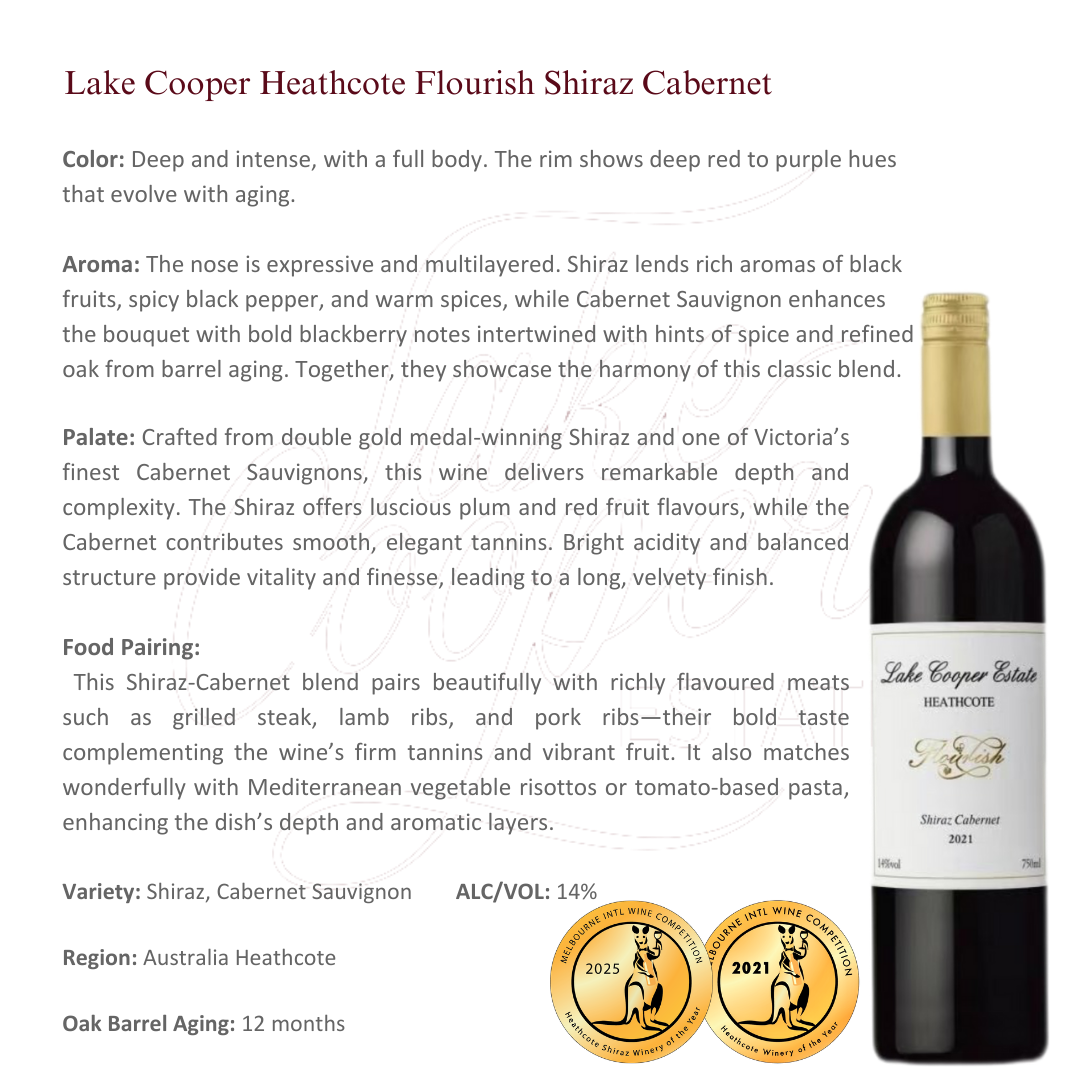 Food Combination: This Shiraz-Cabernet blend pairs beautifully with richly flavored meats such as grilled steak, lamb ribs, and pork ribs.